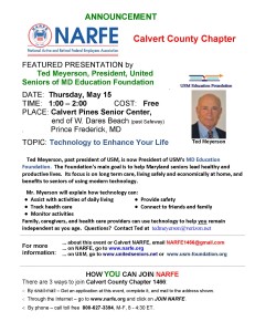Chapter 1466 – Calvert County, is sponsoring a presentation on “Technology to Enhance Your Life” on Thursday, May 15, 2104 by the United Seniors of Maryland. Printable brochure => 1466 – USM 2014 flyer -final